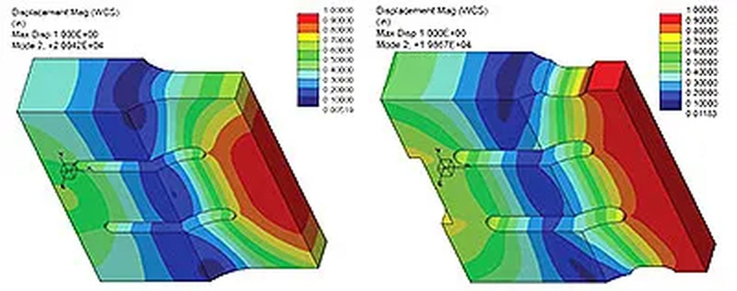 超聲波焊頭可用FEA(有限元分析)進行規劃和優化,答應工程師在實踐制造前評價焊頭的振蕩狀況和應力巨細。最佳的焊頭規劃,是具有均勻的輸出振幅,以及最小的應力。上圖中,左邊(biān)圖片是優化前焊頭規劃,振幅輸出不均勻。右側(cè)是優化後,輸出振幅均勻。